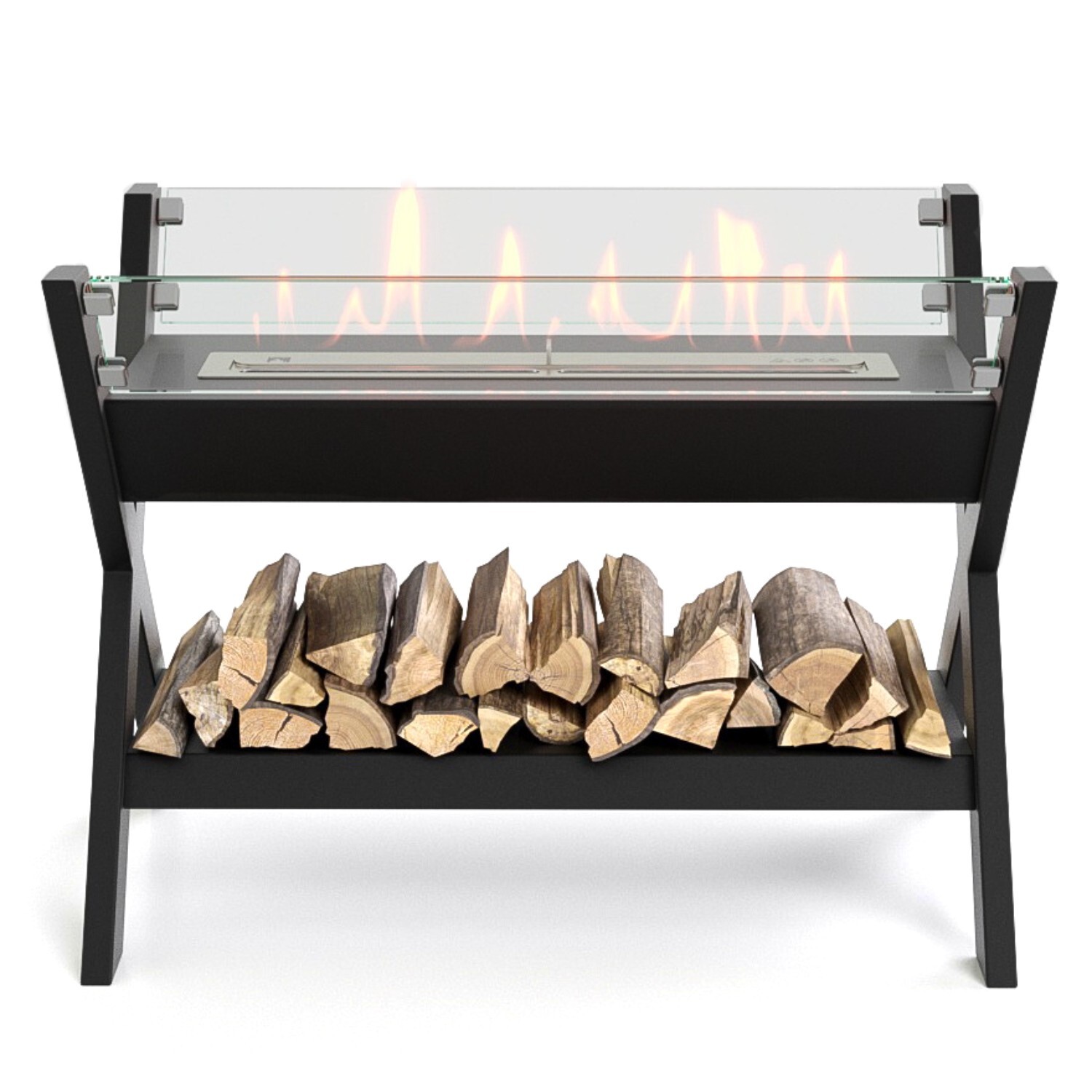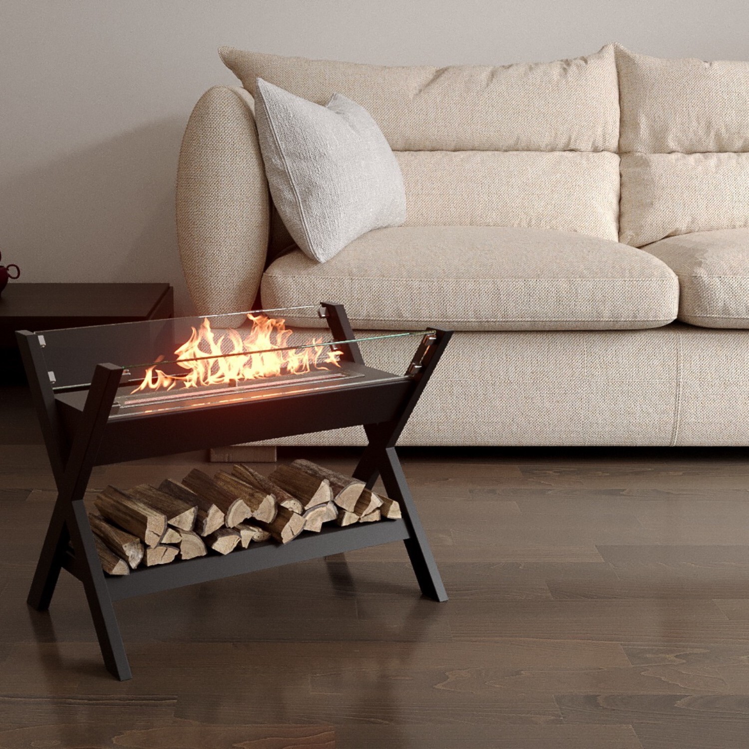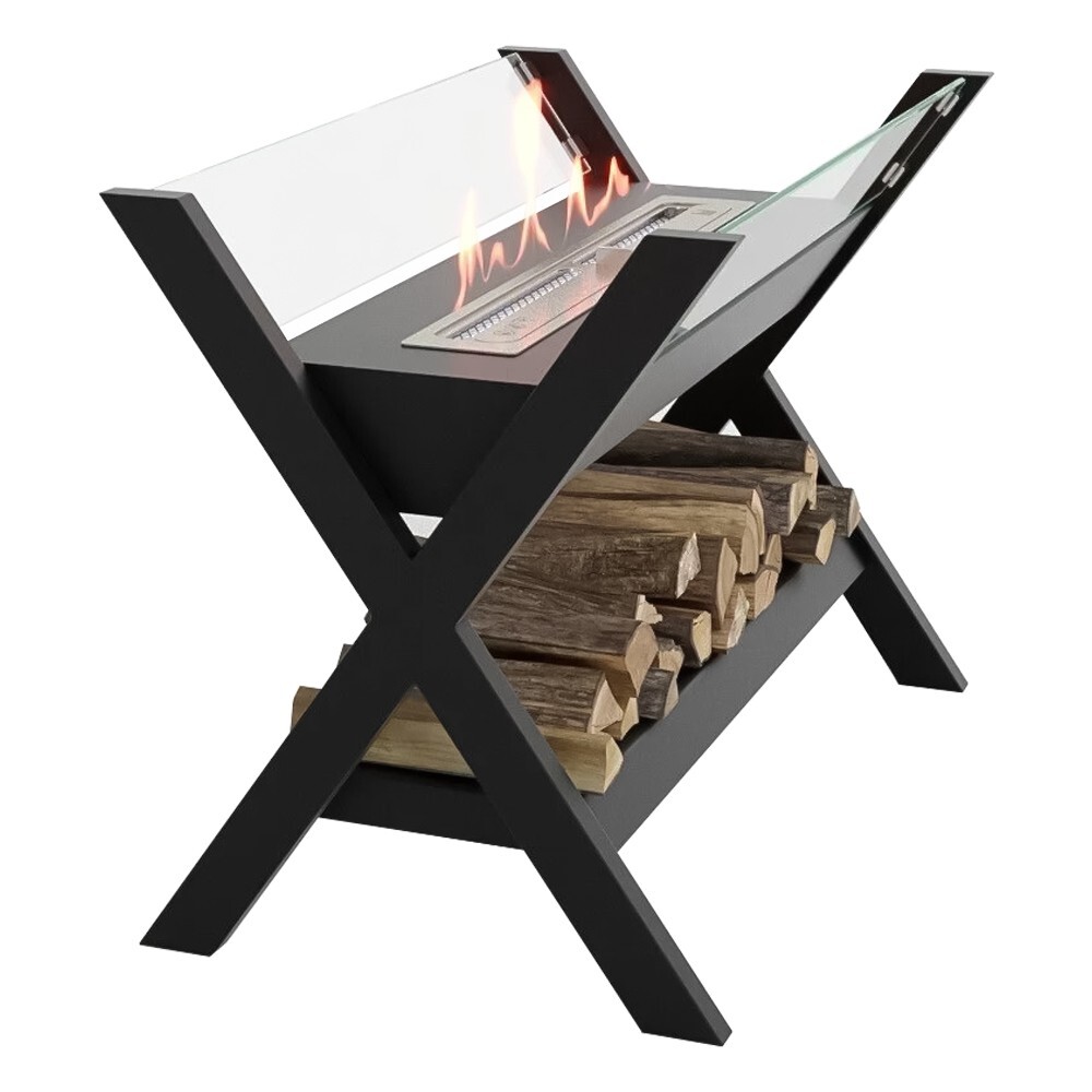 Биокамин представляет собой сборную напольную модель оригинального дизайна из закаленного прозрачного стекла и топливного блока на подиуме. С деревянными натуральными накладками и набором дров с дровницей, обработанных огнебиозащитным средством.