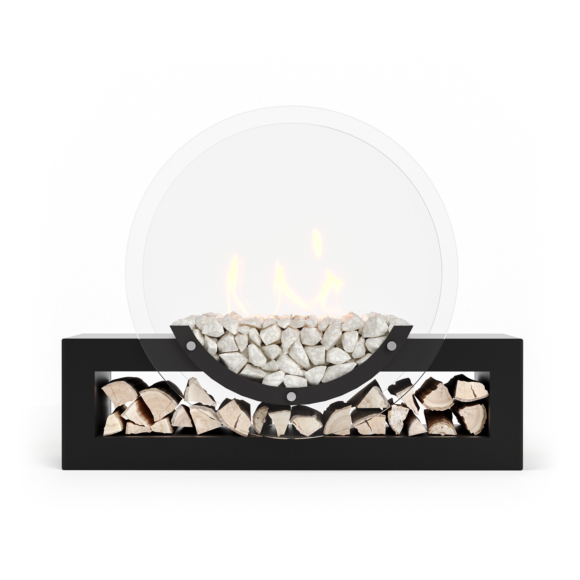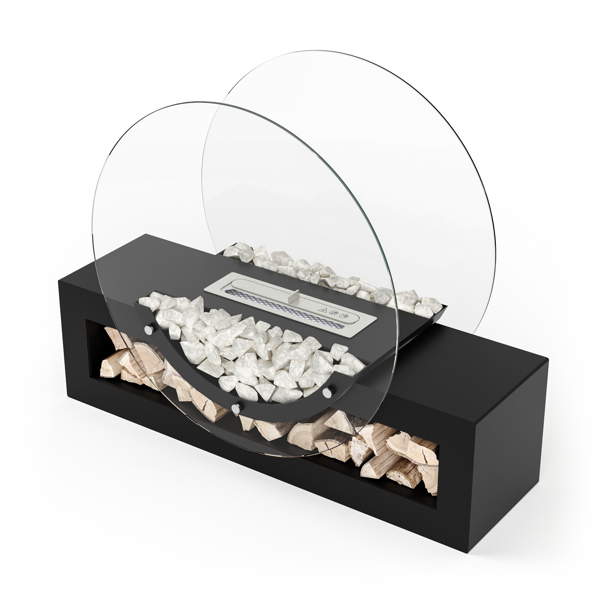 Биокамин представляет собой сборную напольную модель оригинального дизайна из закаленного прозрачного стекла и топливного блока на подиуме. С деревянными натуральными накладками и набором дров с дровницей, обработанных огнебиозащитным средством.