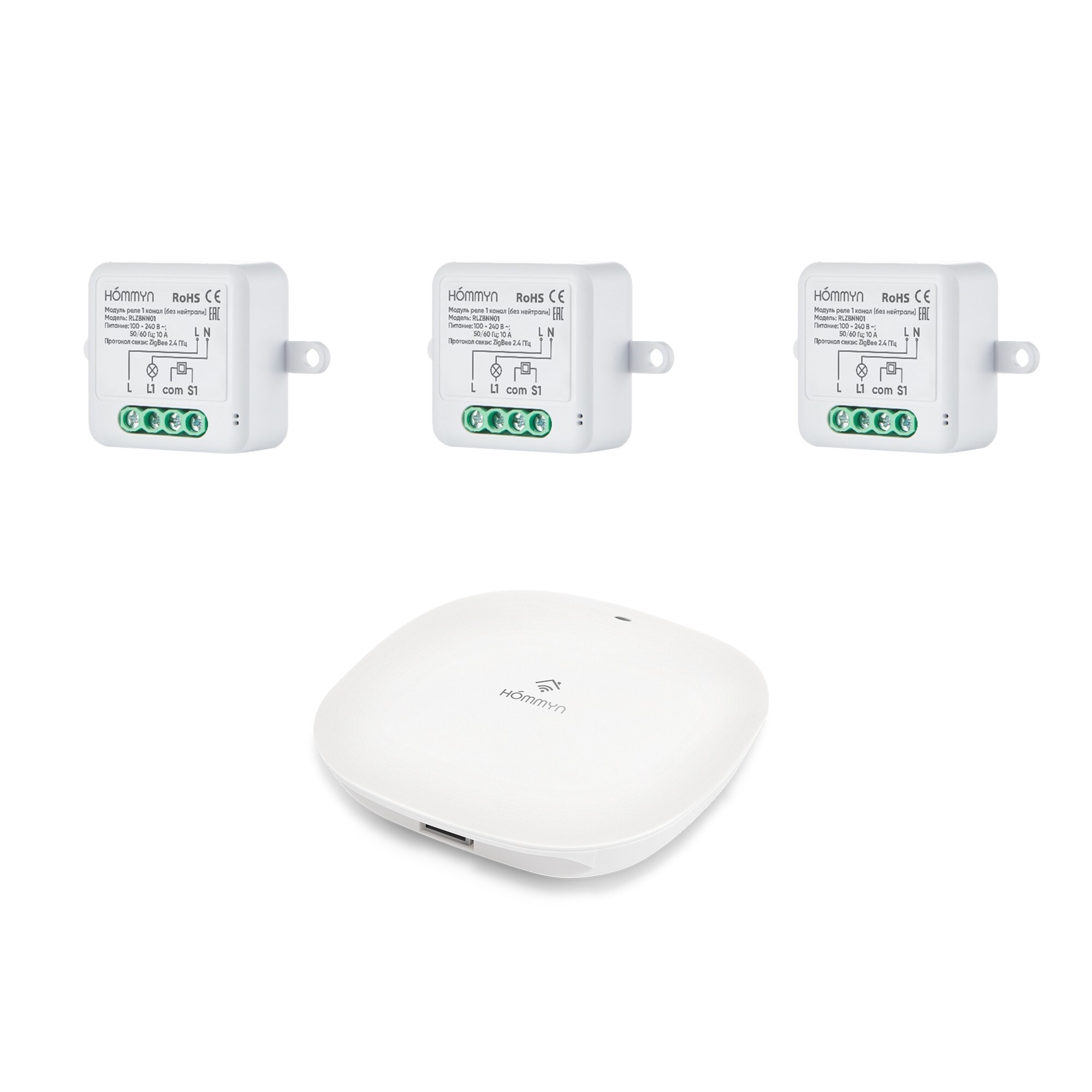 В комплект входят три умных реле на 1 канал (без нуля) и zigbee хаб для подключения в приложение Hommyn.