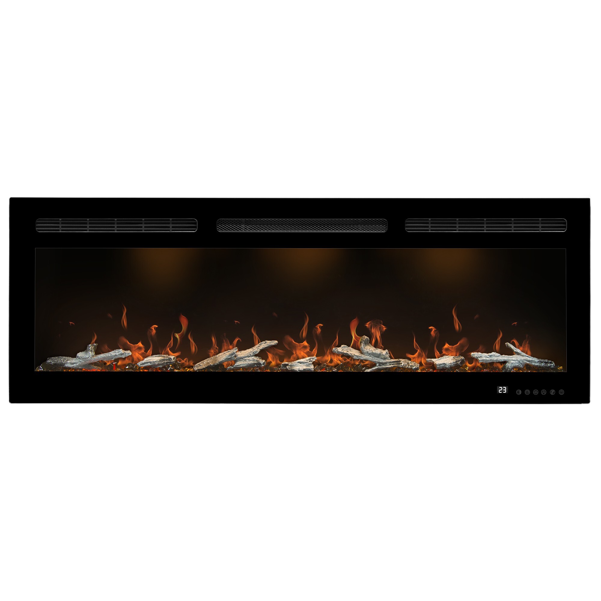 Современный электроочаг с декоративным наполнением из акриловых кристаллов и дров, палитра подсветки которых включает 6 оттенков основного пламени и режим тлеющих дров, 5 уровней настройки скорости пламени.